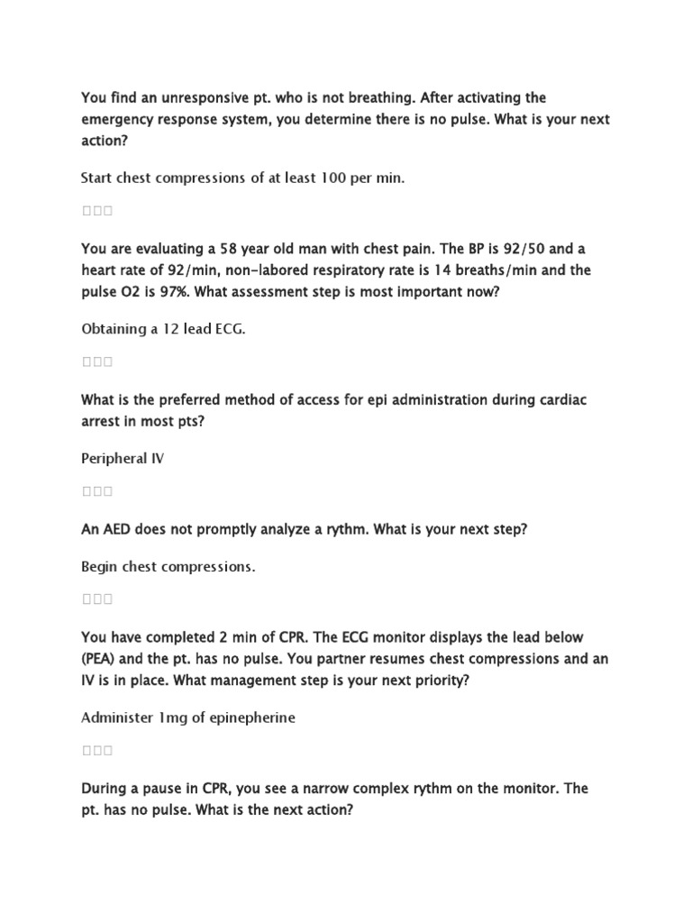 ACLS Post Test | Cardiac Arrest | Cardiopulmonary ... from imgv2-2-f.scribdassets.com We discuss in these acls pretest answers from different topics like acls practice questions, acls pretest answers 2021. Editable & printable pdf / doc Acls (advanced cardiac life support) practice test: For that we provide acls test answers 2021 real test. We've put together the ultimate cheat sheet review with free updated 2021 american heart association (aha) and red cross based practice tests, questions & answers, and pdf study guides/student manuals to help prepare for your cpr / aed / first aid and bls for healthcare providers (basic life support) course. Jun 10, 2018 · so here is the answer to the question. Free acls test answers to pass acls quiz. The national cpr association wants you to be prepared for your next test.